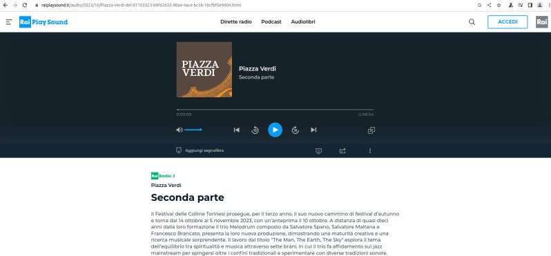Here, listening to their third work, what immediately catches the ear is precisely this fluidity, the ability to blend the great classical lesson with the clear, clean-cut needs of a music that makes jazz themes its undisputed virtue. If you listen to what John Lewis and his companions did, you will always notice the presence of a "polyphonic" cage which effectively forced the quartet to give life to wonderful compositions which made the listener focus his gaze on a more or less remote past, which however this does not happen with the three artists of the Melodrum Trio: the lesson is there, but it does not create a compositional and expressive cage. If anything, it is the meeting of multiple languages that ideally harmonize into one, and therefore I would recommend listening to The Man, the Earth, the Sky starting from the last song which, emblematically, is entitled Esperanto, whose semantic power is expressed precisely in the harmonic blend in which the construct naturally flows from a classical inspiration, given by Spano's piano which fleetingly echoes the Goldbergs Bachian variations, with a jazz dimension without the presence of forcing, of crystallizations, of momentary fixations from one genre to another, since the transition from one to the other is almost not felt, such is the compositional ability implemented.